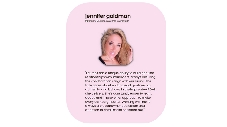 influencer account coordinator aroma360 sep 2023 - dec 2024 led influencer campaigns for Disney, Star Wars, and the NBA, generating $2M+ in sales. built relationships with 200+ influencers and produced 80+ UGC videos to boost brand marketing.
